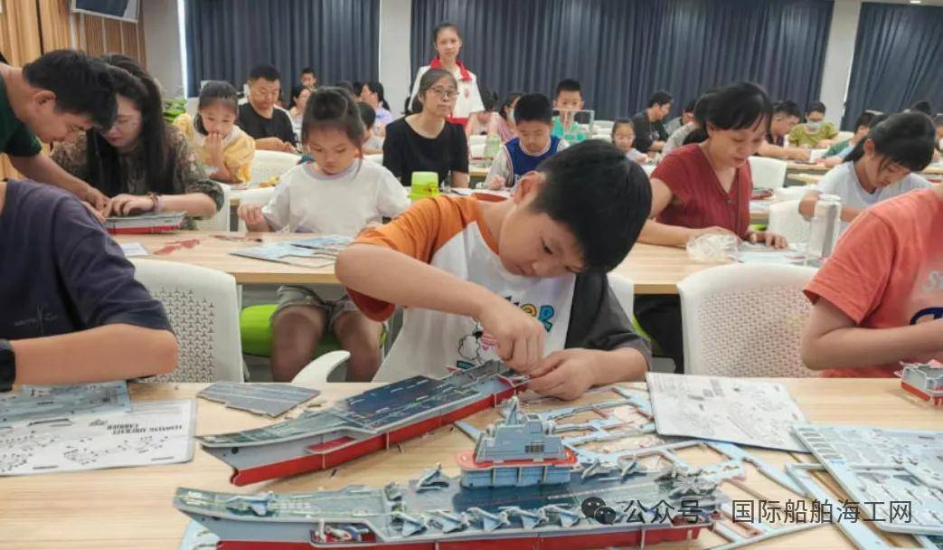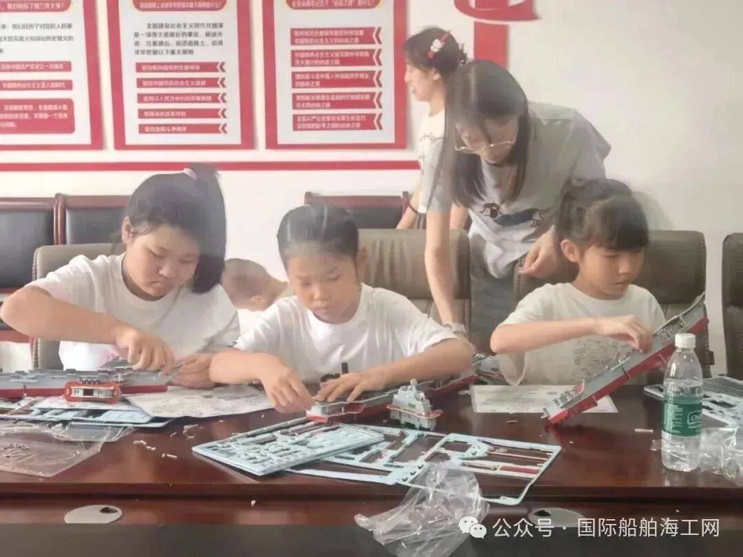 理论知识学习结束后,活动进入了更受期待的动手实践环节——拼装辽宁号航母的3D立体模型。孩子们在老师和志愿者的指导下,纷纷化身“小小工程师”,认真研究图纸,仔细分辨零件,小心翼翼地进行拼接、组装。过程中,他们不仅锻炼了观察力、动手能力和空间想象力,更在实践中重温了刚才学到的航母甲板布局、舰岛结构等知识,对航母的宏伟构造有了更为直观和深刻的认识。当一艘艘微缩版的“辽宁舰”逐渐在孩子们手中成型时,自豪与成就感洋溢在每一张稚嫩的脸庞上。