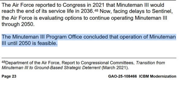 相比于核潜艇,“哨兵”(LGM-35)洲际导弹系统的延期更为致命。当下,“哨兵”导弹项目已经处于瘫痪状态,这是由于美军“贪小便宜吃大亏”导致的——美国空军当时并未充分认识到所需实体建设规模之大,这使得“让哨兵凑合用民兵Ⅲ型导弹发射井”这一降本增笑手段已不可行。而“哨兵”项目在没有批挖井钱之前,已经超支了81%,达到1409亿美元,而当下美国空军不知道从哪儿省出一笔挖井的钱。换句话说,“哨兵”作为一个井基洲际弹道导弹,却连个挖井的预算都没有。显然整个项目已经很难称得上是什么“有序推进”的严肃项目了。